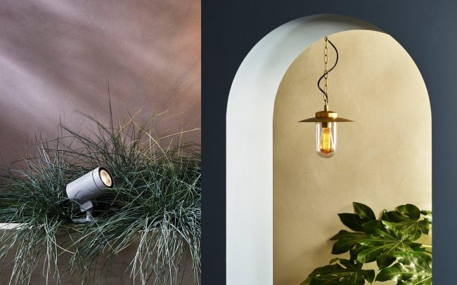 Уличный потолочный светильник Portree Pendant как декоративный элемент сада и Bayville Spike Spot для атмосферной подсветки