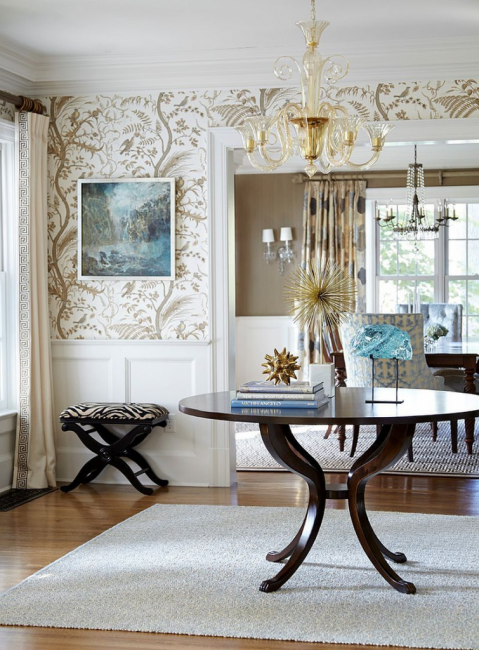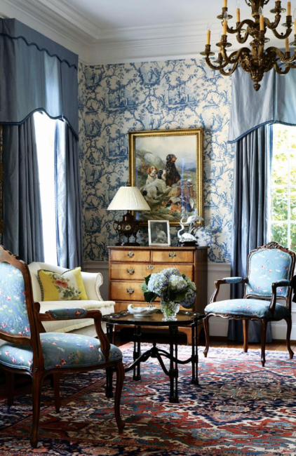 Интерьер в английском стиле: обои с цветочным принтом и потолочный молдинг