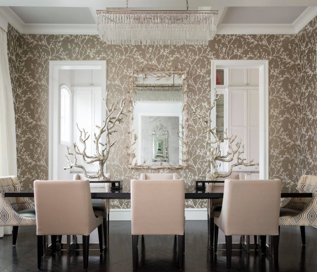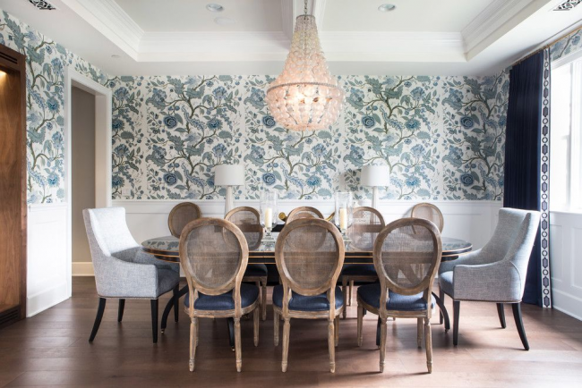 Обои с растительным узором для столовой в английском стиле. Деревянная мебель мягкого бежевого цвета и другие деревянные элементы – традиционный выбор