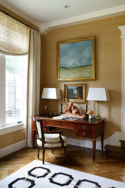 Для кабинета подойдут изделия с приглушенными цветами, создающие необходимую атмосферу. Рисунки – небольшие и не сильно насыщенные, а еще лучше – без рисунков, в полоску или клетку, для кабинета это идеальный вариант.