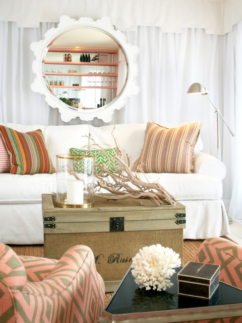 В виде акцентов. Декоративные подушки, салфетки или подставки под посуду, чехлы для цветочных горшков, мебели или столовых приборов, абажуры. Такие детали будут смотреться мило и оживят даже строгие интерьеры.