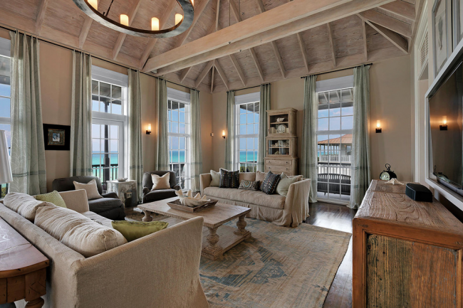 Классические портьеры, длиной до пола, идеально вписывающиеся в строгие, элегантные интерьеры. Их крой не должен быть слишком сложным, ламбрекены или пышные сборки будут смотреться нелепо. Лучше ограничиться простой прямоугольной формой, собирая такие портьеры в лаконичные складки с помощью декоративного шнура или подхватов, декорированных цветами из той же мешковины. Дополнит композицию второй ряд штор белоснежного оттенка.