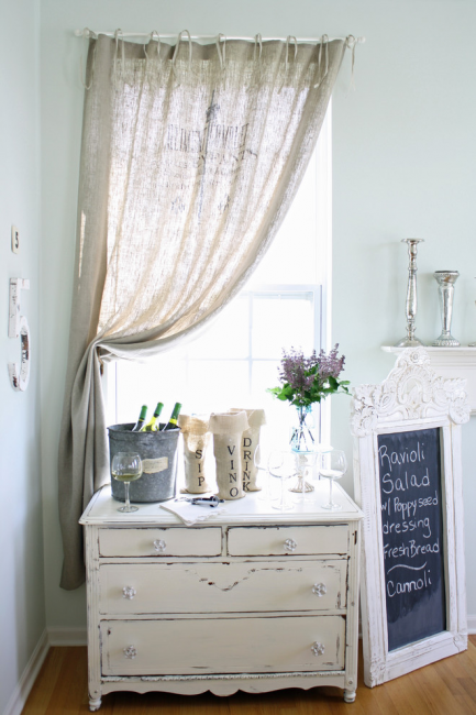 С оборками, рюшами, эффектными завязками. Подобный текстиль может сочетать в себе мешковину и другие, более «нежные» ткани, контрастные по цвету или фактуре. Например, молочный хлопок или белый лен.