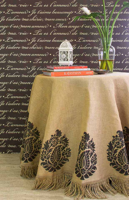 Принты — на мешковине удачно будут смотреться самые разные рисунки, надписи, штампы, печати. Это могут быть фабричные отметки, винтажные логотипы, даже имитация гобелена с цветами