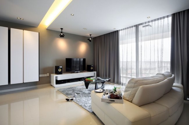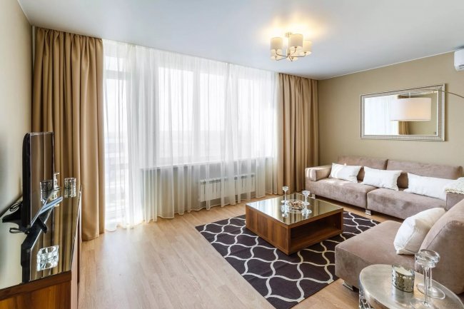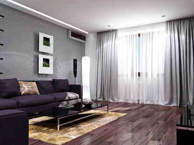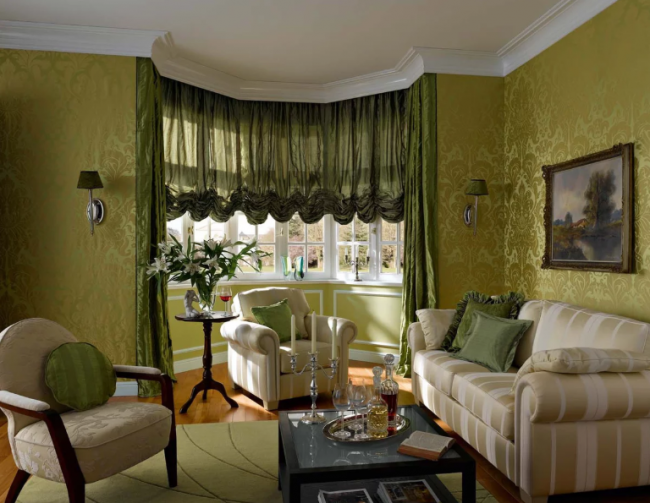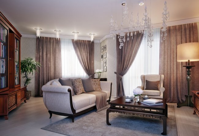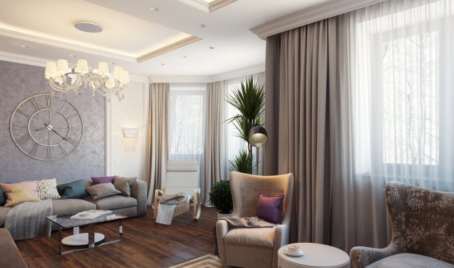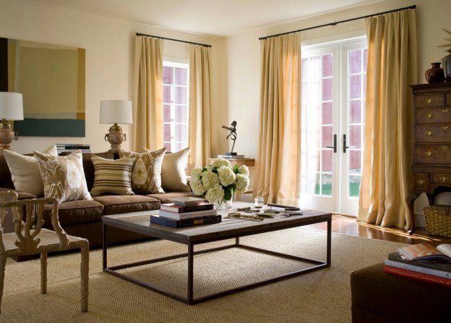 Допустимая разница между оттенками стен и штор в этом случае 2 тона. Для оформления окна в гостиной подойдут такие ткани, как парча, жаккард, гобелен, тафта, бархатно-шенилловая жатка. Эти материалы помогают в создании торжественной обстановки, позволяют внести в помещение некий шик. Они не помнутся и не полиняют, и много лет прослужат вам верой и правдой. Роскошно смотрятся на окнах гостиной твид, вельвет, шерсть, но эти ткани хорошо впитывают пыль, а уход за ними достаточно сложен. Можно использовать искусственное полотно, которое благодаря структуре с легкостью сымитирует дорогую ткань — хлопок, лен, которые, к сожалению, очень сложно разглаживать после стирки, но именно благодаря им помещение наполняется теплом и домашним уютом.