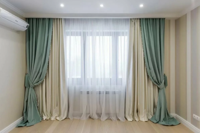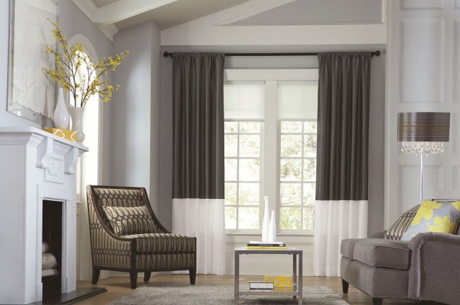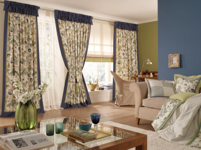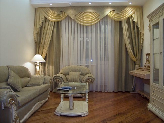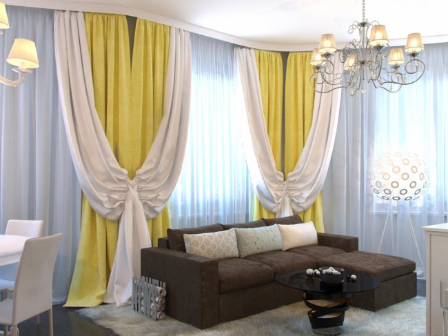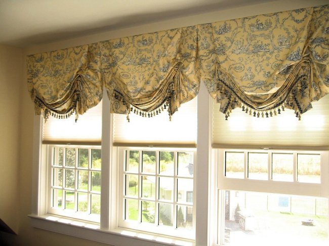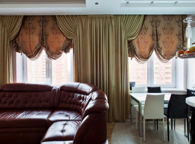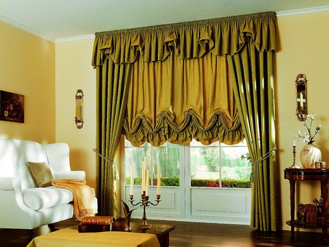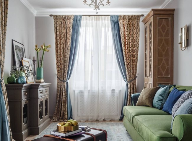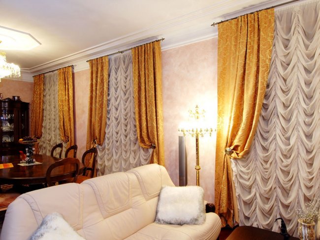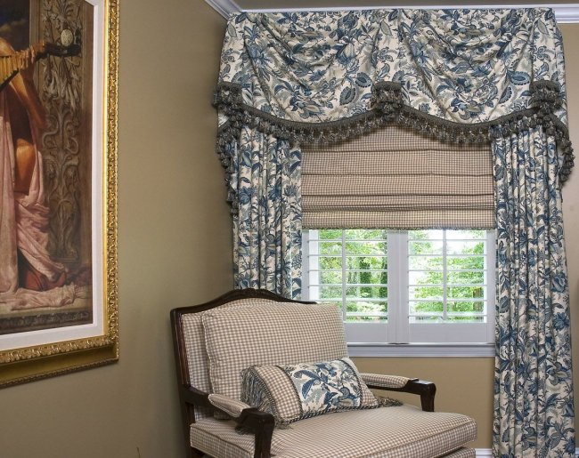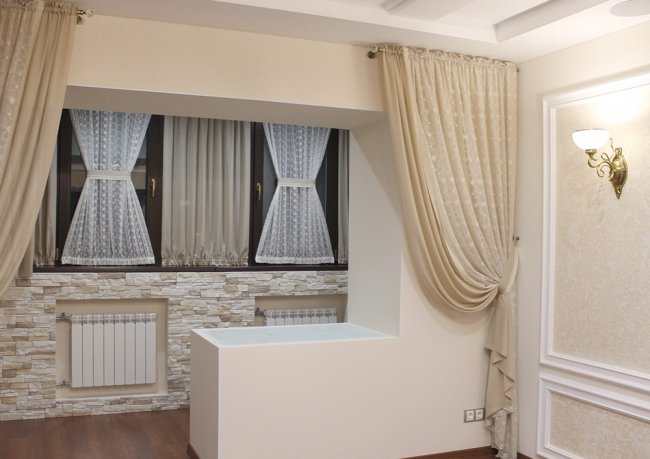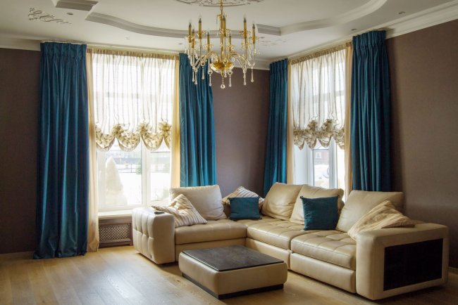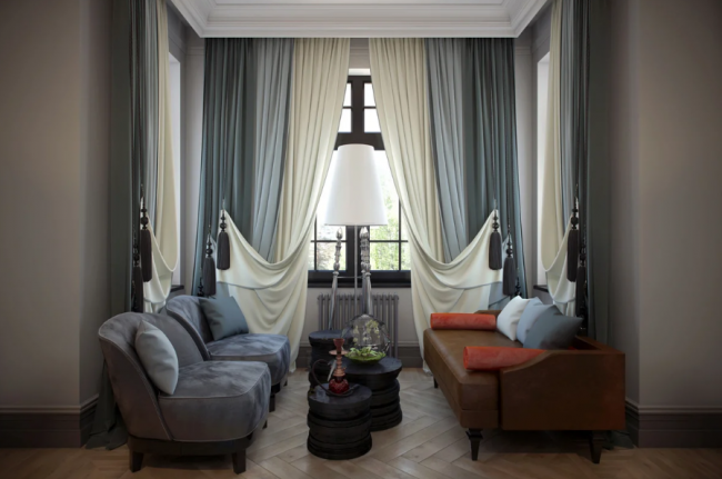 В оконных композициях хорошо комбинируются изделия, принадлежащие одной цветовой палитре, с разной светопропускной способностью, изготовленные из контрастных по плотности, структуре и назначению материалов. Классическим вариантом комбинированных штор является сочетание портьер с гардинами.
