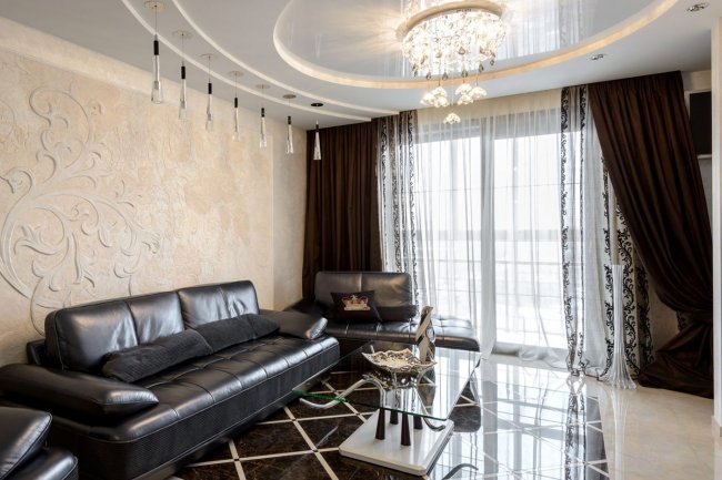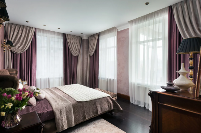 Материал особенно эффектно смотрится в больших залах. В них достаточно пространства для развешивания объемных драпировок. А вот в маленьких комнатах бархатные шторы выглядят тяжелыми и громоздкими, «съедают» и без того дефицитное пространство.