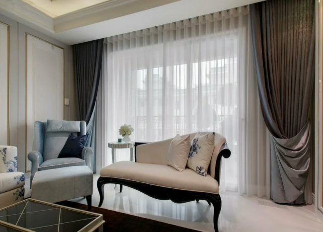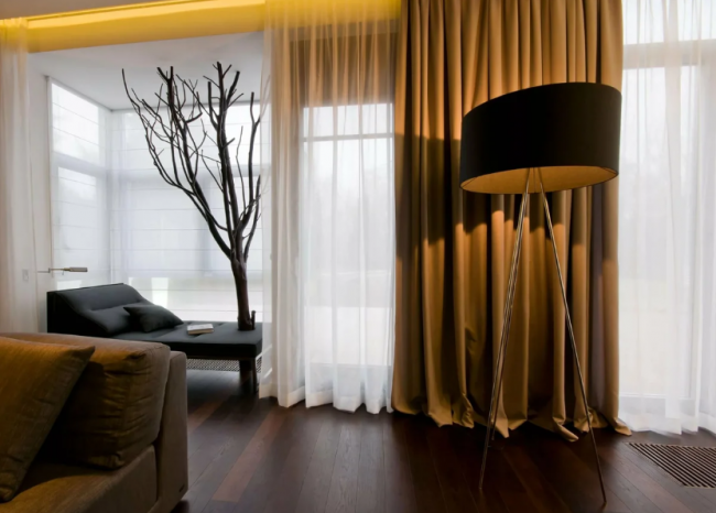 Представляют собой шторы из тонкой, легкой и полупрозрачной материи. Наиболее популярные представители гардин – изделия, выполненные из тюля, вуали, сетчатой ткани, органзы. Такие занавески закрывают окно полностью или частично. Гардины преимущественно имеют светлые оттенки: бежевые, белые, светло-голубые. Их часто комбинируют с портьерами и с другими видами штор. Но они могут выступать и в качестве самостоятельного элемента. Важно сказать, что они сами по себе не выполняют защитных функций, а служат лишь украшением окна и позволяют немного скрыть происходящее в квартире.