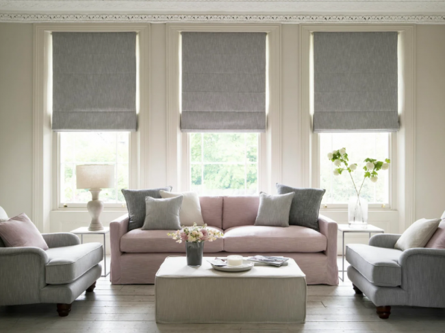 Римские шторы в закрытом виде представляют собой сплошное полотно с закрепленными планками. При их подъеме образуются красивые складки. С помощью простого механизма, мы, потянув за шнурок, с легкостью можем поднять эти полотна. Для создания этих штор используются как тонкие, так и плотные ткани. Они хорошо смотрятся в кухнях, в детских и других небольших помещениях. Можно комбинировать их с классическими шторами при необходимости закрыть от солнца большие окна.