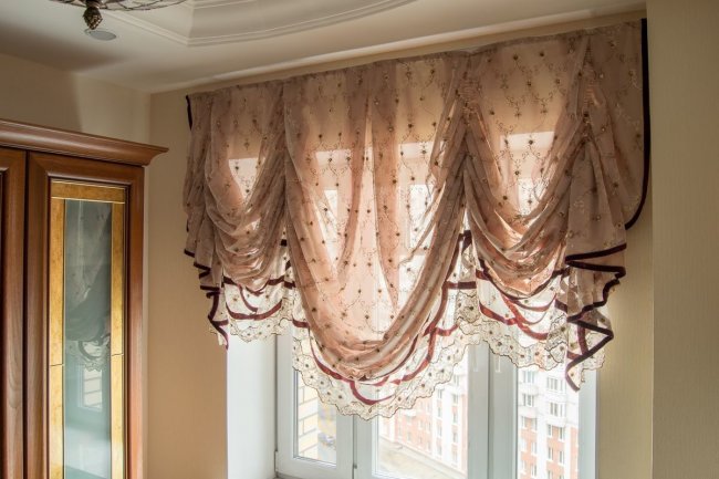 Занавеска может быть собрана в складочки, украшена рюшами, оборками. Очень стильно выглядят гладкие ламбрекены без декора. Однако при наличии низких потолков от этого элемента декора лучше отказаться или использовать модель, которая не способна уменьшить и без того маленькую высоту потолка и объем комнаты. Сложно обозначить функционал ламбрекена, и все же мы попытаемся это сделать. С его помощью можно скрыть не очень эстетичный верх штор, сбалансировать оконное убранство, сделать его гармоничным и завершенным.