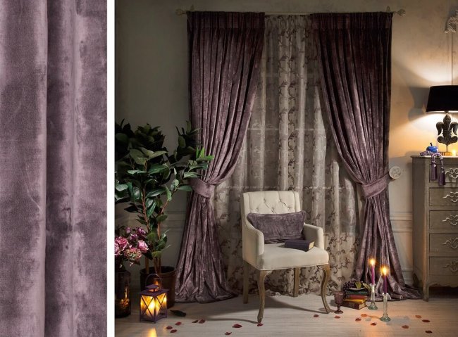 Ворсистая тяжелая мягкая ткань, изготавливаемая из натурального шелка. Она состоит из основы и ворса. Есть подобный более доступный вариант шелкового бархата. В таком случае используется хлопковая основа. Существует искусственный бархат из синтетических волокон на основе полиэстера. Бархат идеально защищает помещение от солнечных лучей, шума. Он не склонен к выгоранию, сохраняет тепло в помещении.