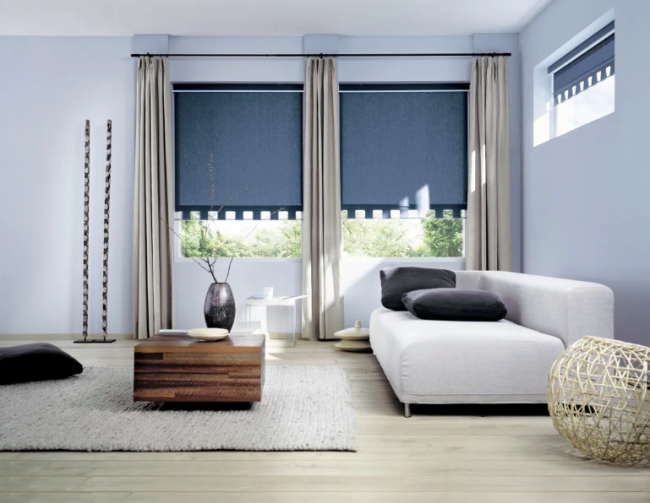 Современные изделия из трехслойной светонепроницаемой материи, главной задачей которой является защита помещения от солнечного света, уличного шума или температурных перепадов. Шторы могут быть выполнены в классическом, японском, минималистическом и других стилях. Они могут быть рулонными, римскими.