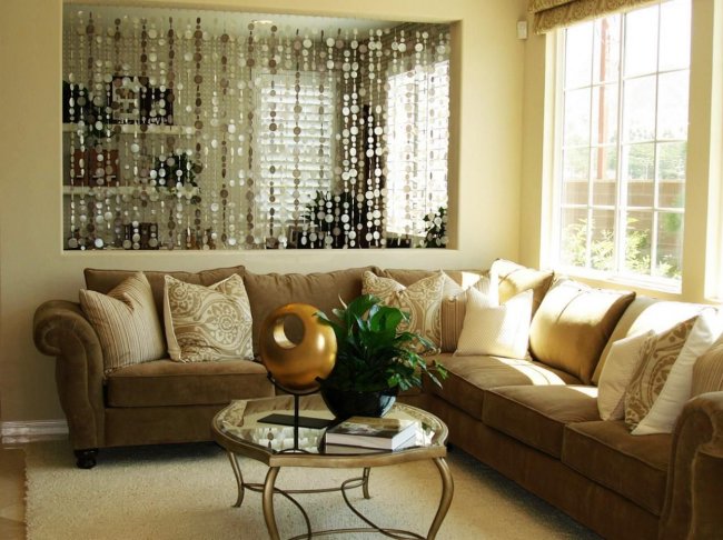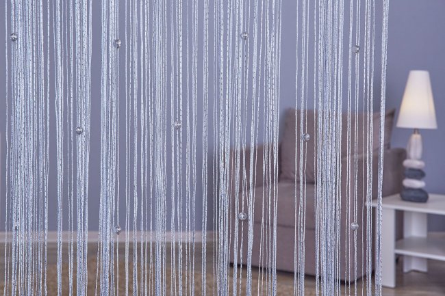 Нитяную штору можно самостоятельно изготовить из лески или хлопковой пряжи, нанизав на нее ракушки, бусины, кольца или крупные пайетки. Такая штора станет отличным украшением для дверного проема, пригодится для визуального зонирования пространства.