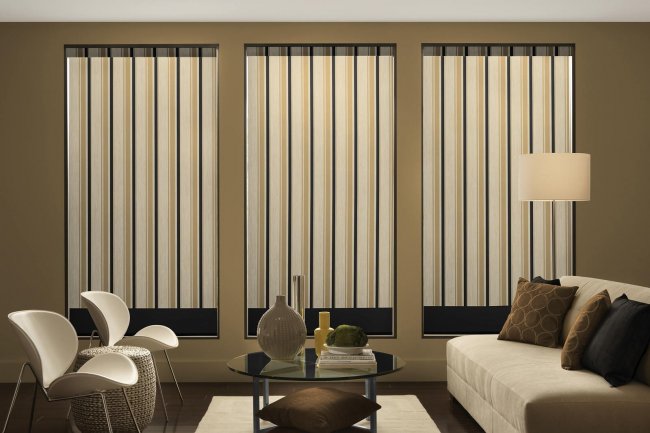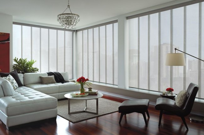 Это конструкции, собранные из вертикальных или горизонтальных ламелей. Ламели – пластины или пластинчатые структуры. Для их изготовления используют пластик, специальные ткани или плиссе. Жалюзи схожи с портьерами, так как обеспечивают качественную защиту помещения от солнца. Разные конструкции преимущественно отличаются друг от друга подъемными, раздвижными или поворотными механизмами. При заказе главное – правильно рассчитать количество ламелей, чтобы по бокам от закрытой конструкции не оставались щели.