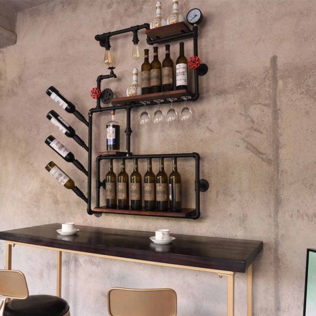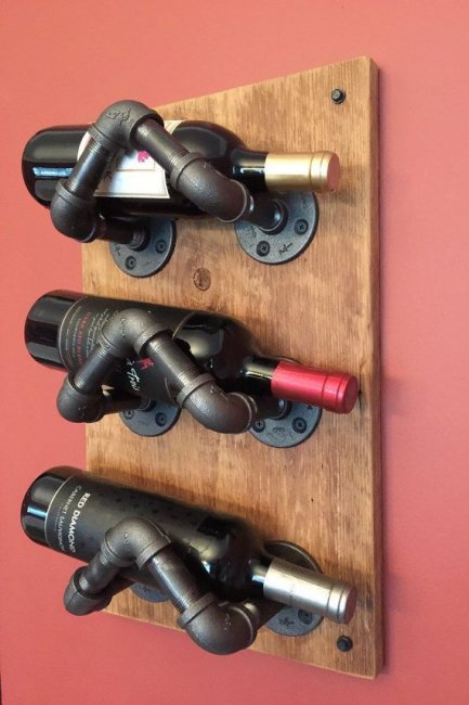 Сделать оригинальную полку для вина в индустриальном стиле можно из одних чугунных труб или применить вариант хитрого сплетения металла с деревом. Для изготовления изделия потребуются простые водопроводные трубы, несколько фитингов и кусок доски. Древесина будет выступать в качестве подставки, а трубы будут удерживающими элементами.
