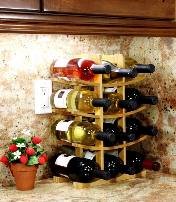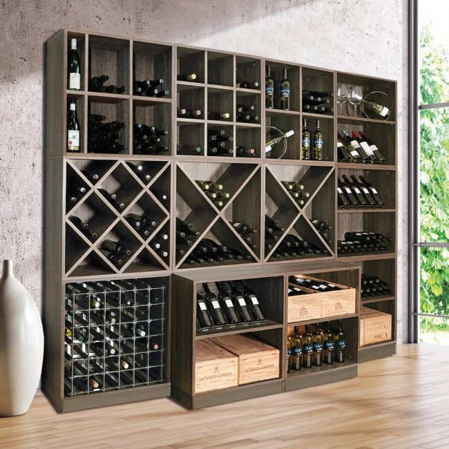 Конструкции предназначены исключительно для горизонтального размещения тары. Чаще всего их делают из дерева, но встречаются и дизайнерские модели, изготовленные из других материалов. Количество ячеек может быть разным, в зависимости от их величины бутылки могут располагаться либо по отдельности, либо лежать друг на друге. Для облегчения поиска конкретного сорта каждую нишу можно подписать.
