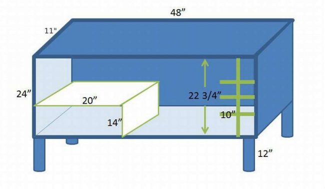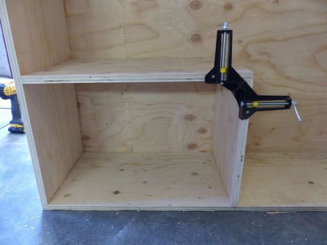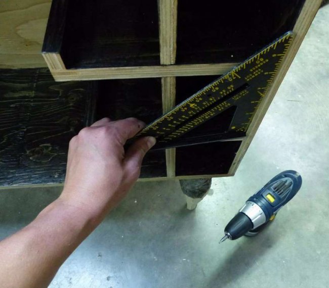 Чтобы соорудить отдельные ниши под каждую емкость, необходимо в горизонтальных полочках выполнить небольшие пропилы под прямым углом. В эти пазы вставляются вертикальные элементы и жестко фиксируются при помощи клея и саморезов. На завершающем этапе крепятся дверцы и фурнитура. После сборки мебели поверхности покрывают лаком, устанавливают на заранее выбранное место. Основание пола обязано быть твердым и ровным.