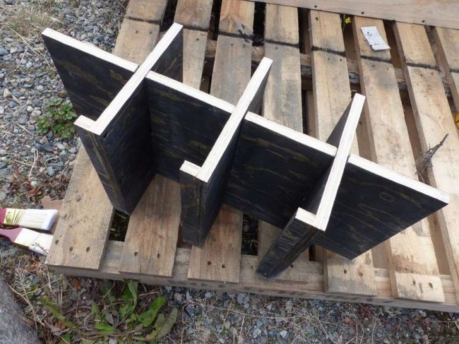 Потребуется одна широкая доска для стойки и пять маленьких для полок. Заготовки легко сделать самостоятельно, просто распилив древесину на нужное количество частей по размеру. В полки вбиваем гвозди по краям каждого элемента, и собираем конструкцию с помощью саморезов и клеевого пистолета. Каждый этаж можно украсить оригинальной табличкой с сортом вина, названием, годом урожая.