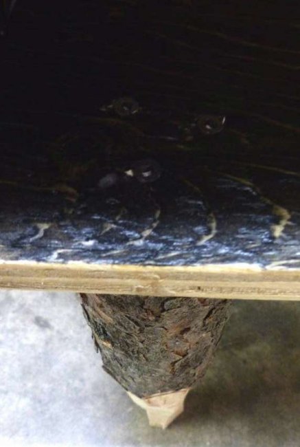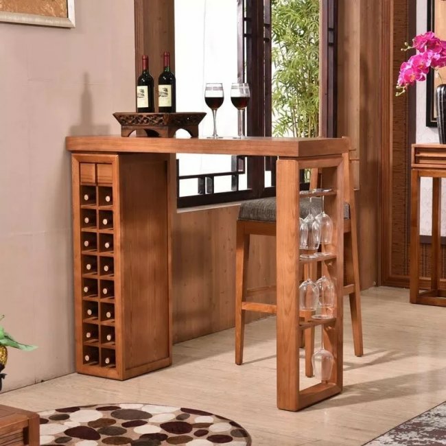 Можно сделать простой предмет мебели по стандартному плану или придать ему оригинальности, подключив фантазию. Интересно выглядит круглый столик с боковыми отсеками для вина. К нижней части столешницы прибивают круговые планки и делают в них отверстия под размер бутылок. Ножки можно сделать прямыми или создать фантазийную конструкцию.