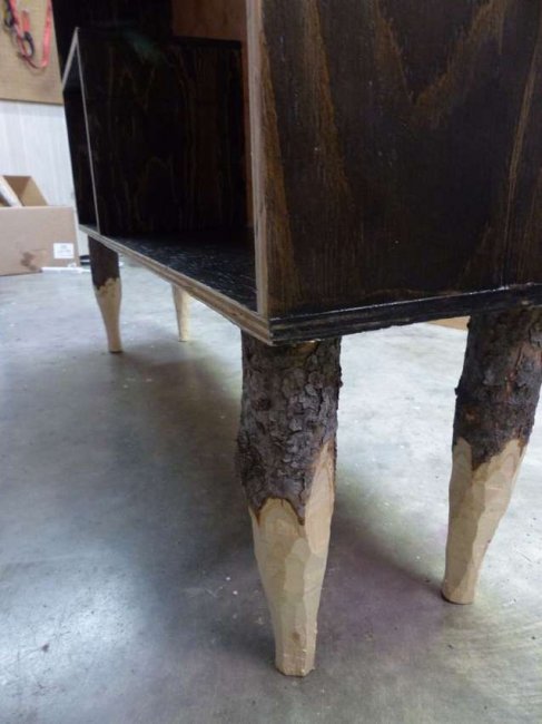Для начала необходимо облагородить старую тумбу. Все срезы обрабатываем наждачной бумагой, окрашиваем в любой цвет или просто покрываем лаком. Затем надо нарезать куски труб подходящего размера специальной ножовкой. На следующем этапе обрабатываем получившиеся ячейки ацетоном и окрашиваем в нужный цвет с помощью аэрозольного баллончика. Скрепляем все элементы веревкой, скотчем или клеем.