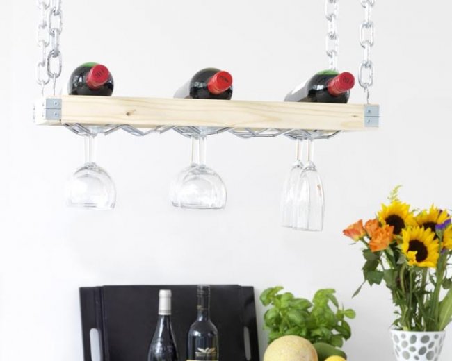 Деревянный брусок распиливают на несколько частей по схеме в соответствии с пропорциями. Все края тщательно отшлифовывают инструментом со специальными насадками. На двух подготовленных элементах отмечают место расположения реек и выемок для бутылок. Затем с помощью клеевого пистолета закрепляют перекладины и вырезают пропилы. В нижней части подвесной полки устанавливают металлическую решетку для подвешивания бокалов.