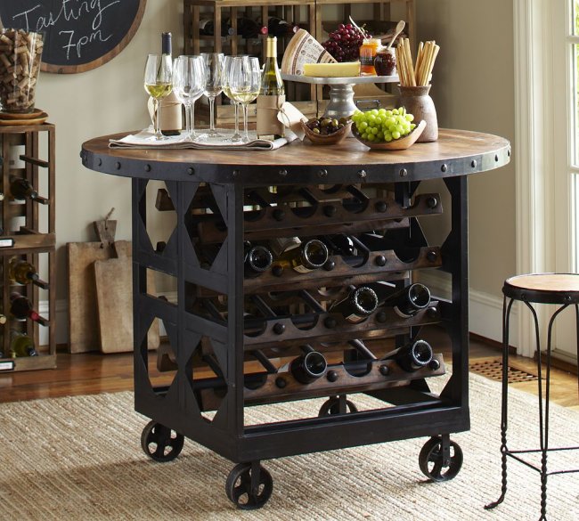 В домашних условиях вино может храниться в самых разных местах. Лучший вариант – специальный холодильник. Но, если устанавливать такую технику возможности нет, можно сделать красивый столик для гостиной со специальными отверстиями для бутылок.