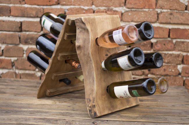 Узкие полочки можно крепить не только к стене, но и к корпусной мебели. Самое простое изделие, расположенное по вертикали, представляет собой деревянный брус или доску, с просверленными насквозь круглыми отверстиями определенного диаметра. В эти пазы с двух разных сторон горизонтально вставляются горлышки бутылок. В итоге получается своеобразное дерево с ветками.