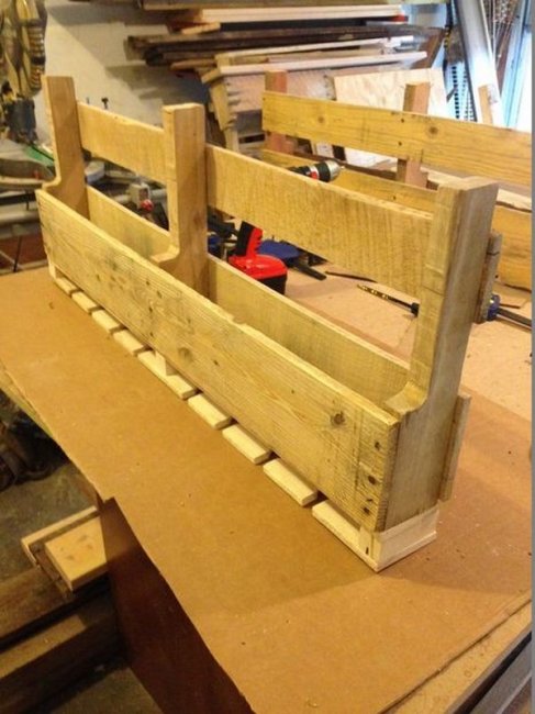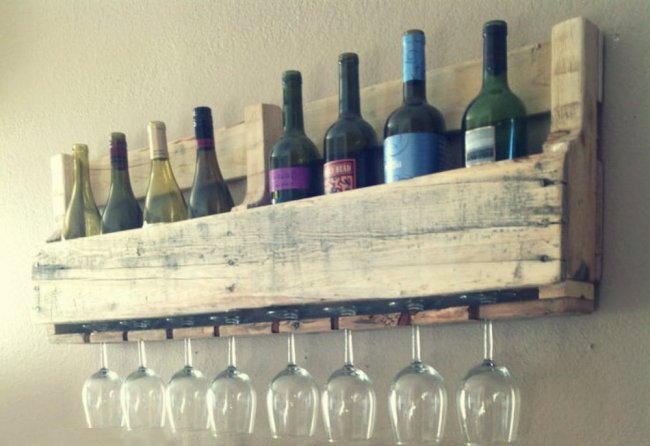 В первую очередь все заготовки из поддона необходимо хорошо отшлифовать, чтобы при эксплуатации полки не посадить занозу. Затем делаем разметки и вырезаем выемки для ножек бокалов. Отмечаем по уровню место расположения полки на стене и крепим с помощью дюбелей или саморезов.