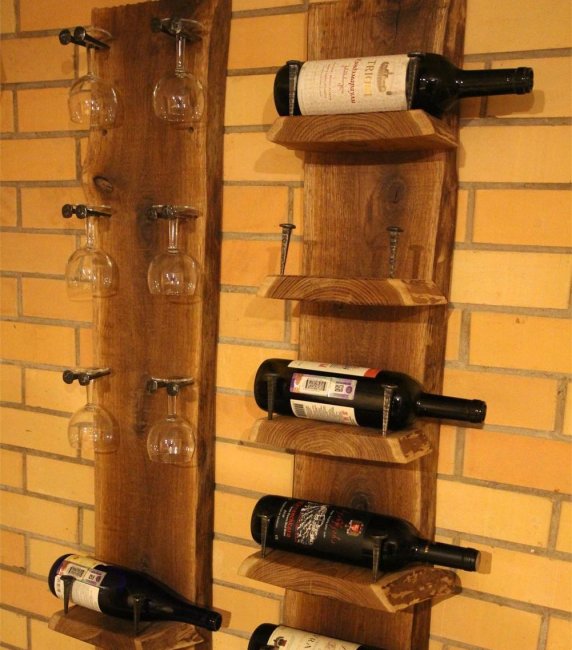 Отличная идея для тех, кто не желает тратить много сил и времени на изготовление подставки для винных бутылок. Придать оригинальности конструкции можно за счет креативных металлических держателей. Хорошо будут смотреться на старой деревянной доске большие чугунные гвозди.