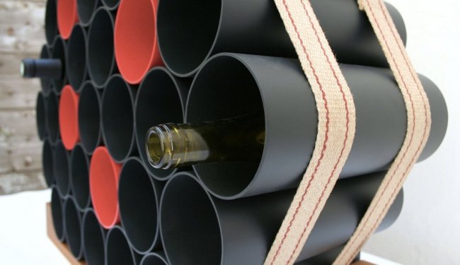 Самый простой вариант изготовления оригинальной полки. Но такая конструкция не будет отличаться эстетичностью и впишется не в каждый интерьер. Для изготовления потребуются ПВХ трубы подходящего диаметра. Размер внутреннего круга должен немного превышать диаметр винной бутылки. Поместить самодельную полку можно в старую тумбочку или на основание из фанеры.