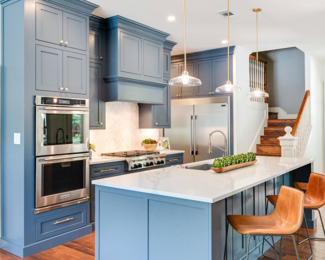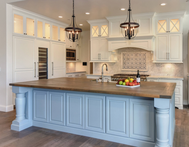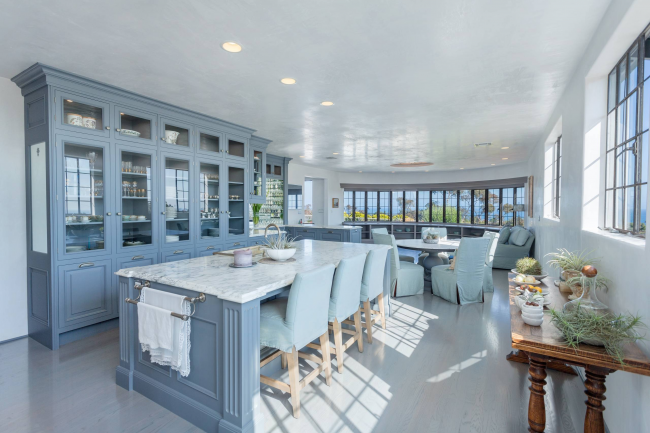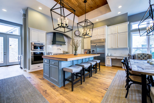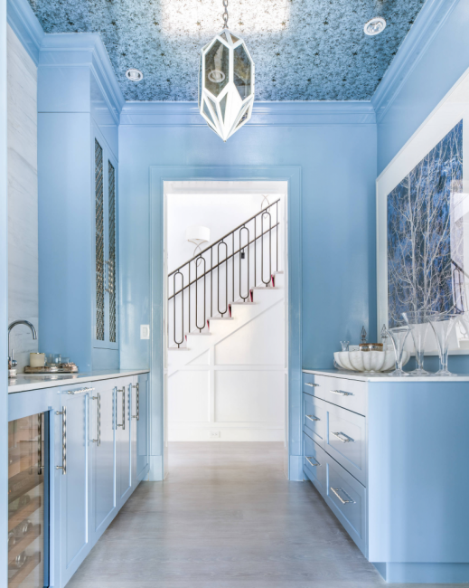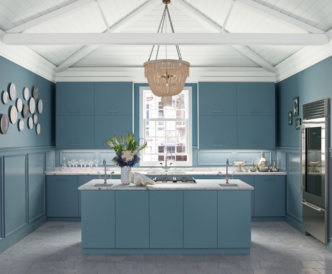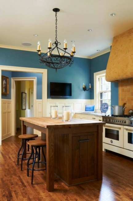 Голубая кухня с массивной люстрой станет главной «фишкой» дома