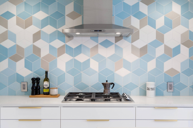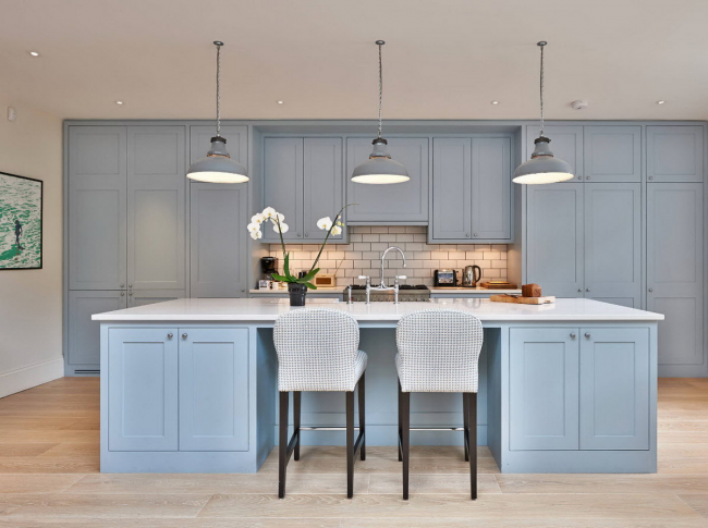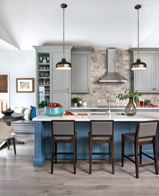 Серо-голубая палитра цветов на кухне