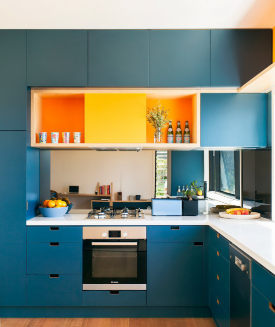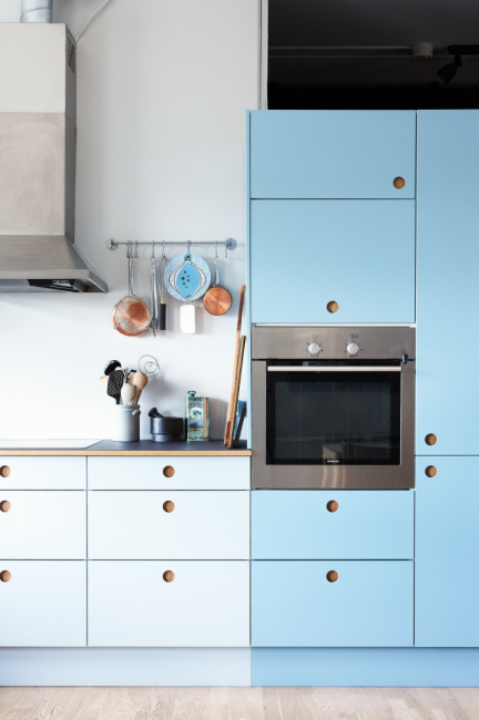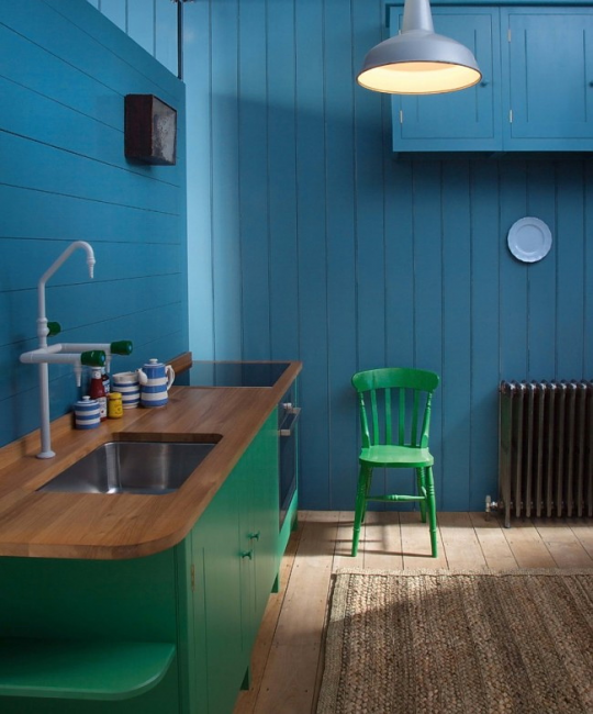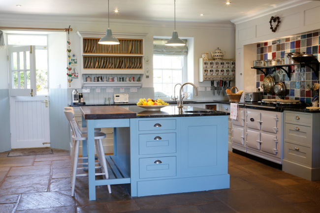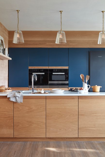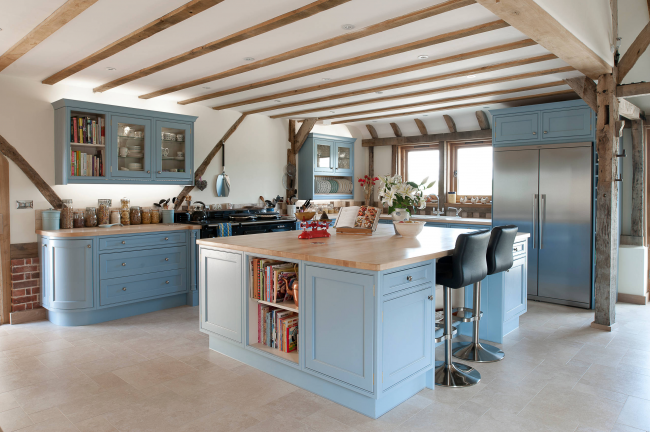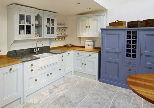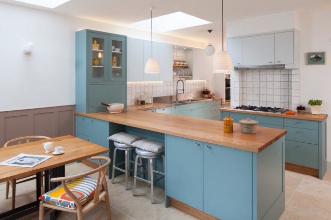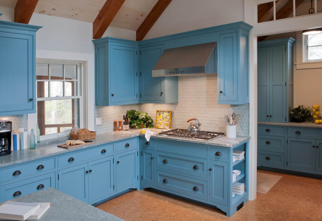Голубая мебель с деревянными столешницами смотрится изысканно