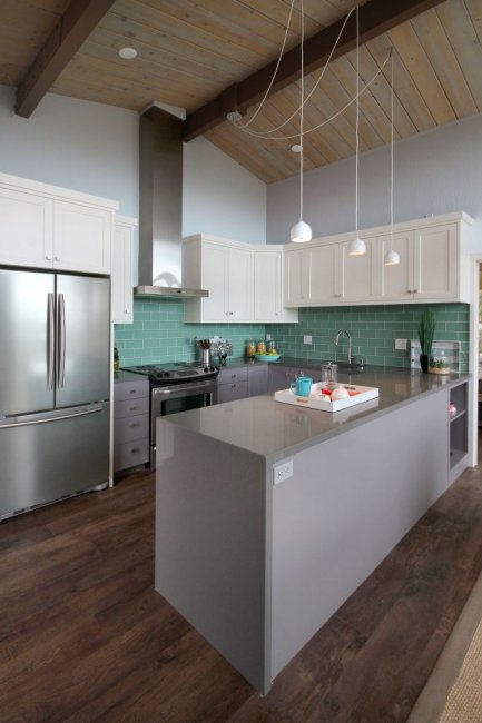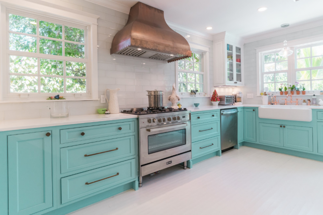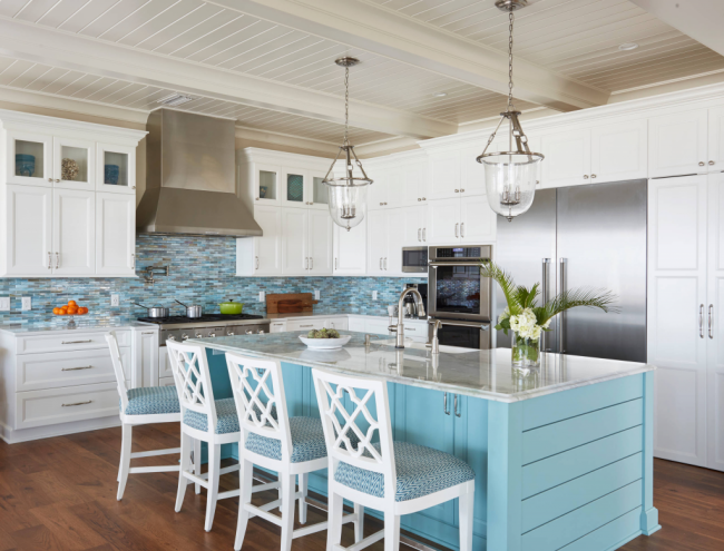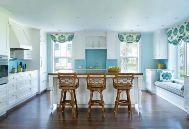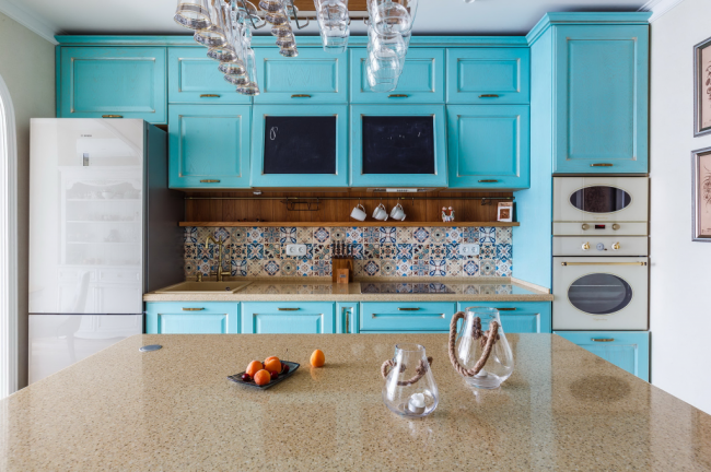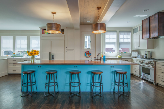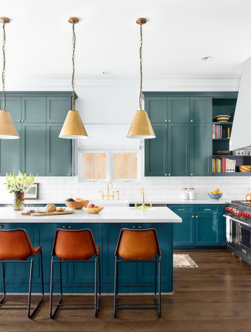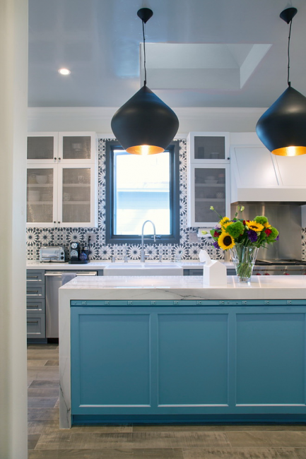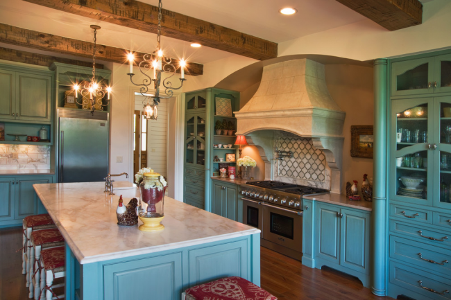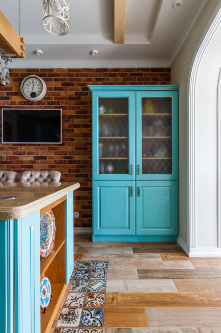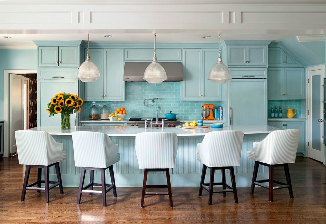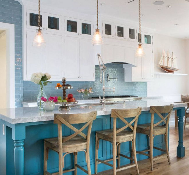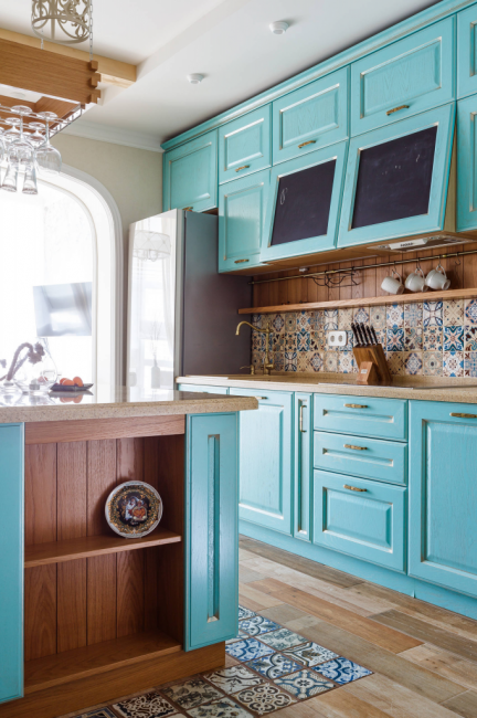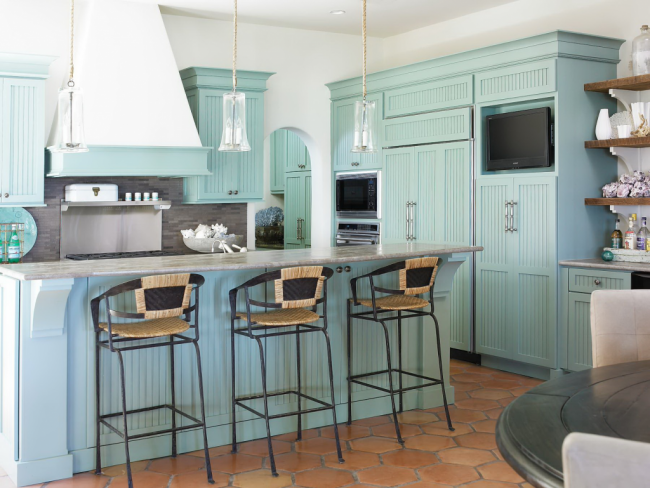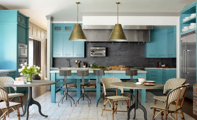 Бирюзовый кухонный остров отлично вписывается в общую атмосферу