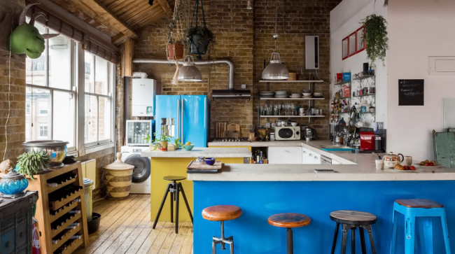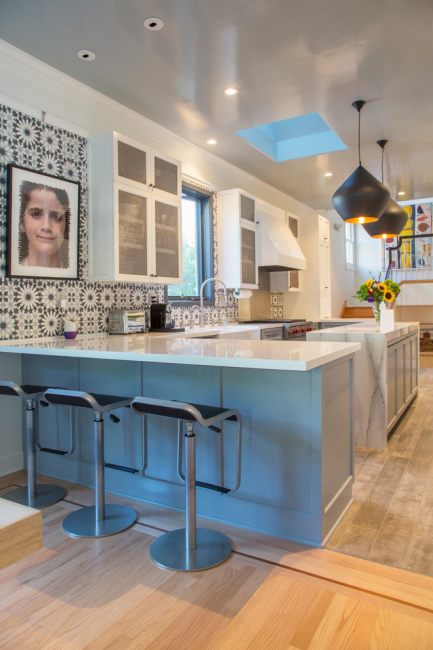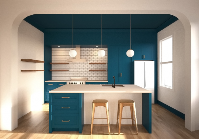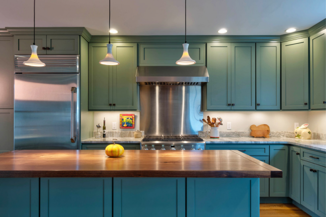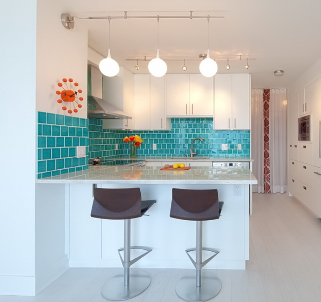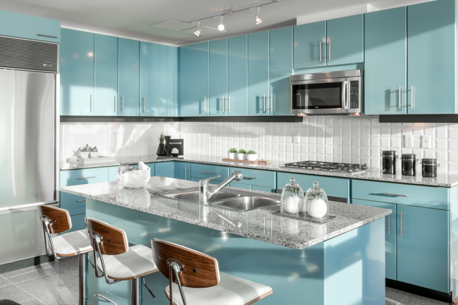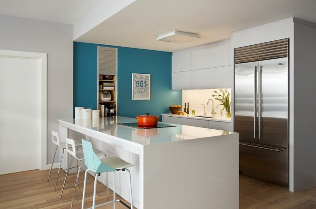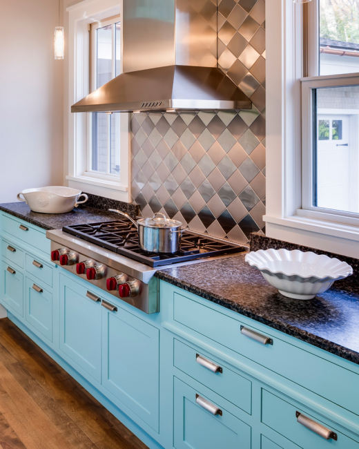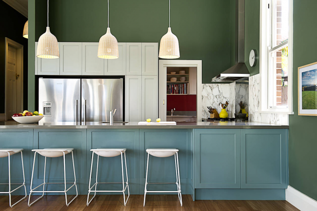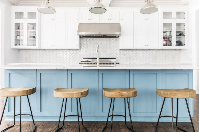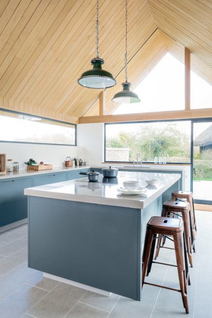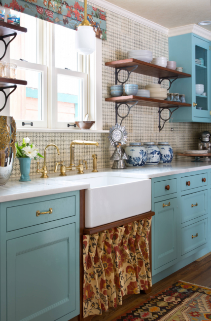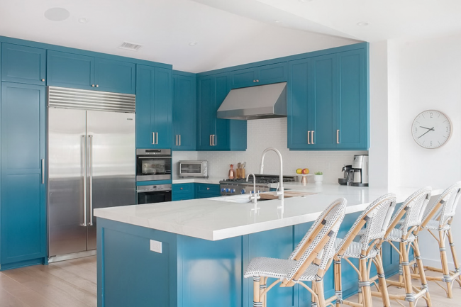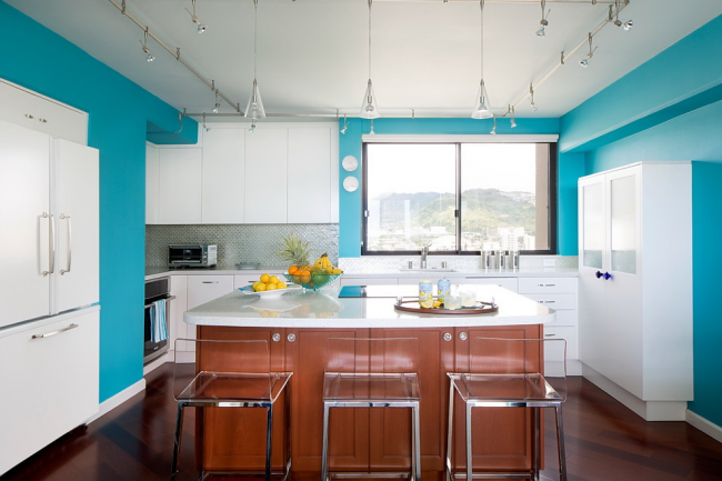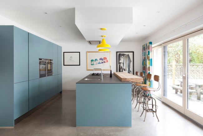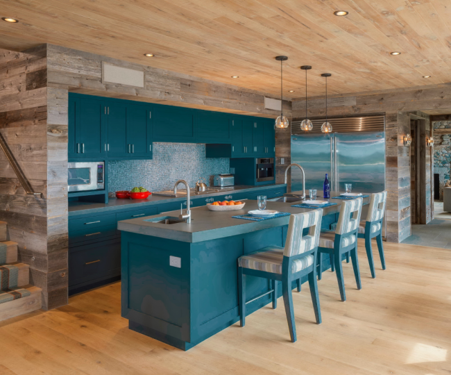 Бирюзовый кухонный остров отлично вписывается в общую атмосферу