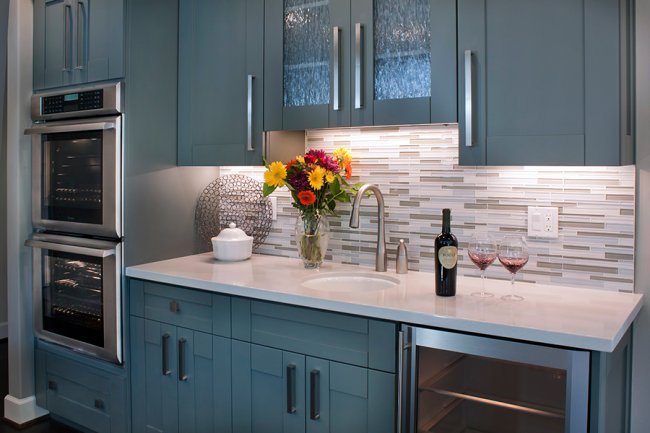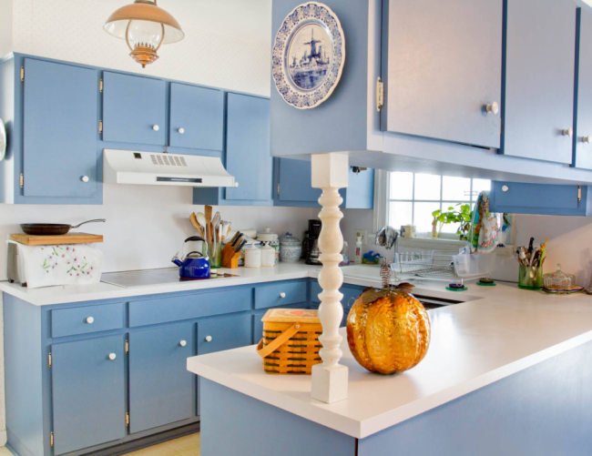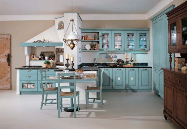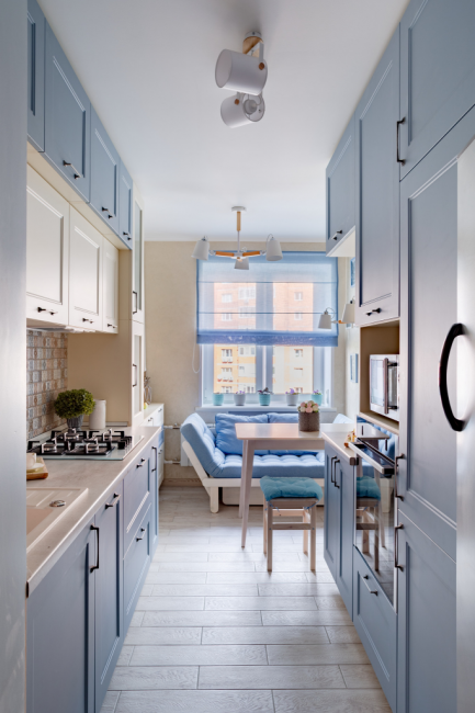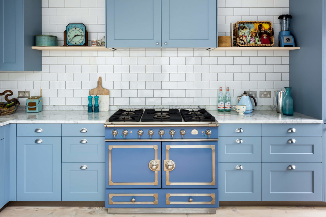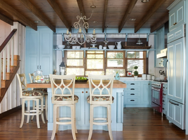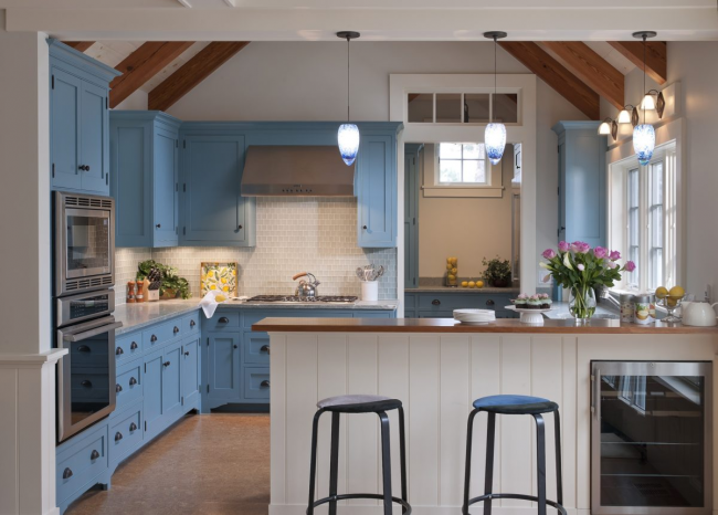 Кухня в голубых тонах красиво будет смотреться в разных стилях – от классического до современного. В наше время этот цвет активно применяется в интерьерах стиля прованс или кантри.