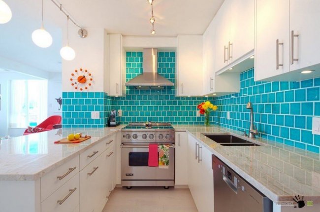 Зелено-голубое сочетание позволит создать на кухне настоящую сказку. Фон в таком случае рекомендуется сделать белым – он подчеркнет яркость зеленых и голубых предметов.