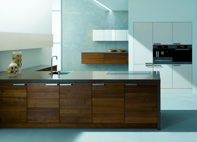 В качестве мебели выбирайте образцы из дерева насыщенных или светлых оттенков. В зависимости от размеров кухни и личных предпочтений вы можете расположить мебель следующими способами: