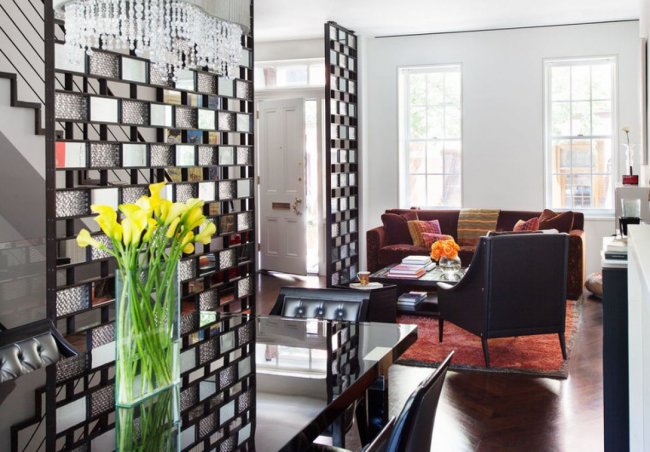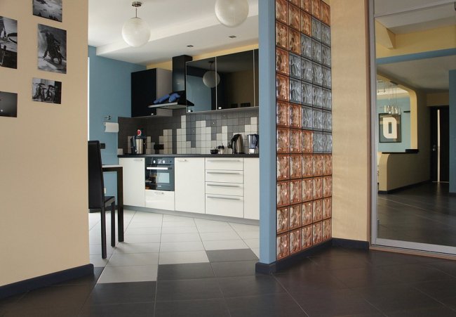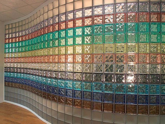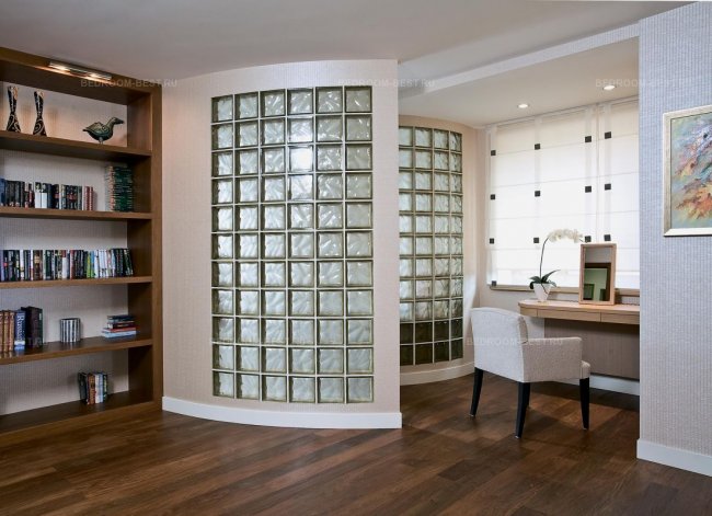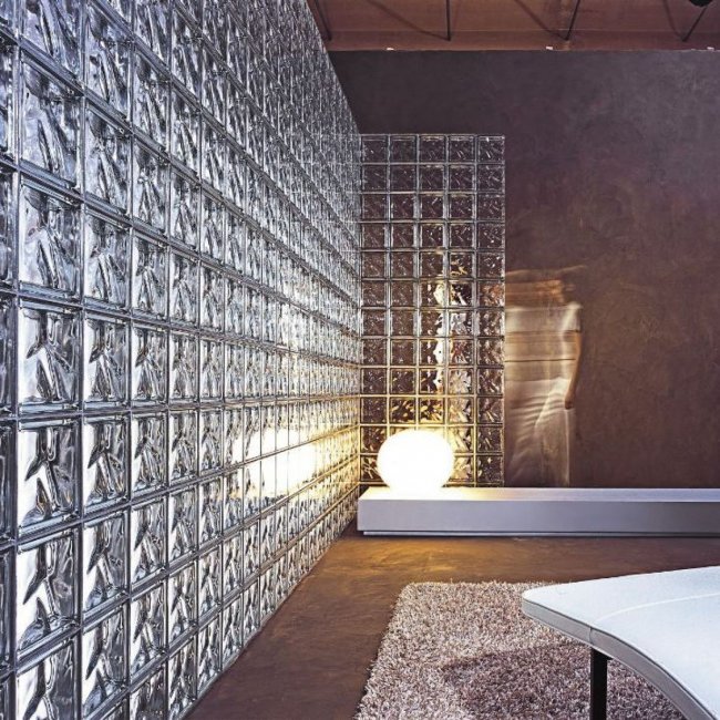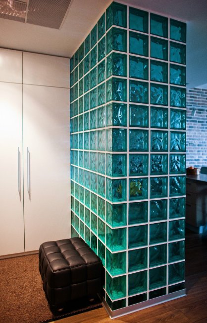 Красиво будет смотреться в зале или прихожей перегородка в виде полупрозрачных кирпичей разной текстуры. Переливающиеся детали создадут атмосферу уюта, обеспечат хорошую шумоизоляцию. Даже цветные элементы можно устанавливать у окна, поскольку стеклянные блоки пропускают 90% солнечных лучей и не будут затемнять пространство.