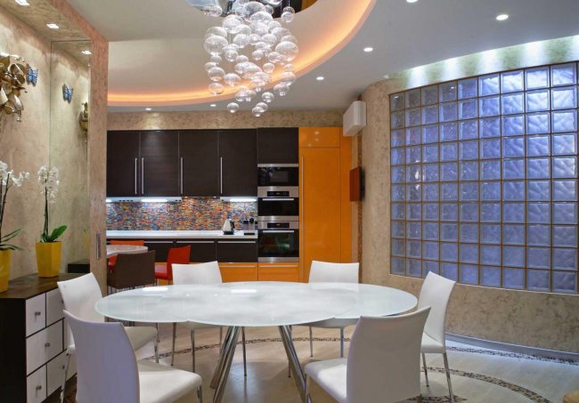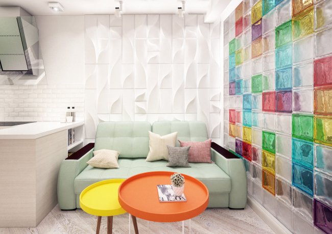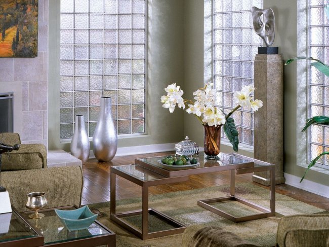 С помощью практичного современного материала можно создать отличный декор, который станет настоящим произведением искусства. Стеклянные квадраты устанавливают вдоль одной из стен гостиной, по периметру окон, рядом с межкомнатной перегородкой. Выложенные по запланированной схеме разноцветные блоки станут изюминкой интерьера.