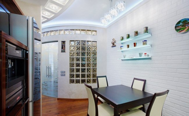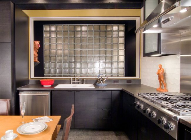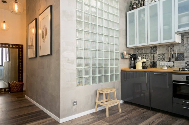 Чаще стеклянные блоки на кухне используют, чтоб отделять пространство. Красивая матовая перегородка в цвет отделки будет удачным решением для разделения столовой и зоны приготовления пищи. Практичная конструкция из одинаковых квадратов легко очищается, не впитывает запахи и долго сохраняет привлекательный внешний вид.