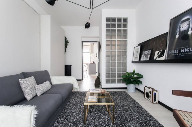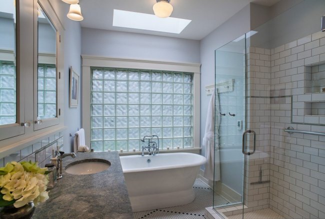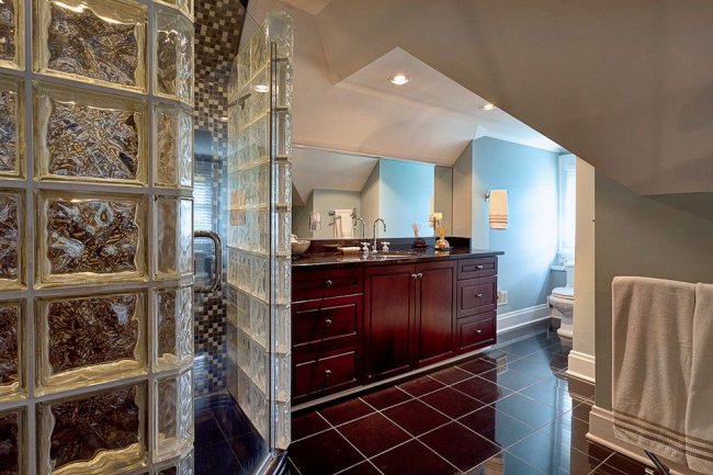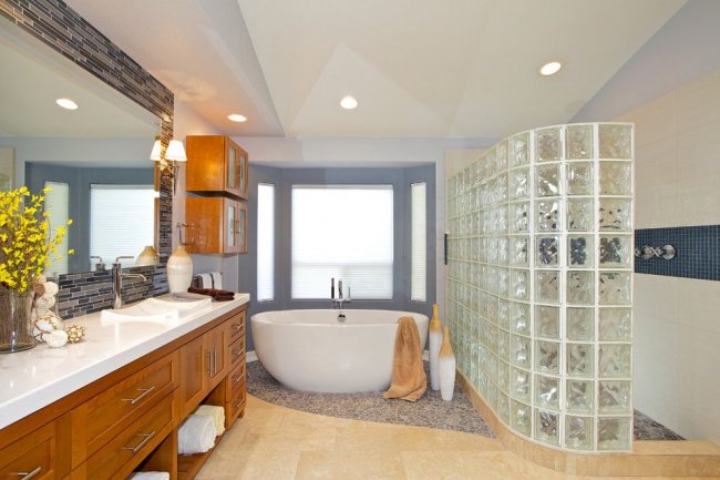 Если заменить одну из стен или ее часть стеклянным блочным декором, можно зрительно расширить пространство. За счет проникновения света из соседних комнат значительно улучшится освещение. В маленьких комнатах лучше использовать одинаковые по фактуре и цвету детали.