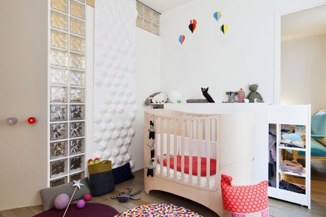 Оригинально в детской будет смотреться разноцветное панно с запаянными мультяшными персонажами внутри каждого элемента. Невысокие конструкции из блоков используют для разделения пространства, отгораживая зону отдыха от игровой, устанавливают рядом светильники.