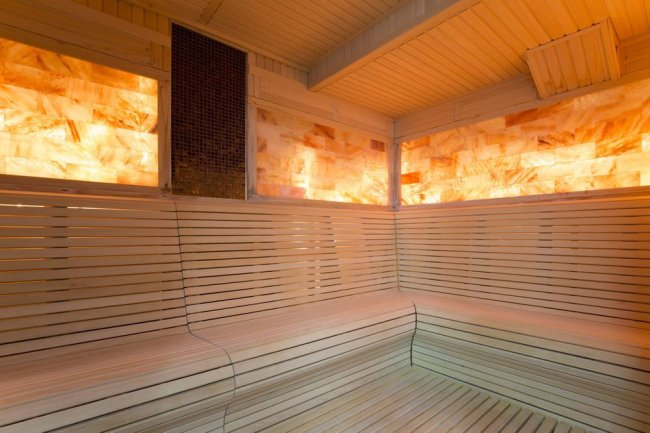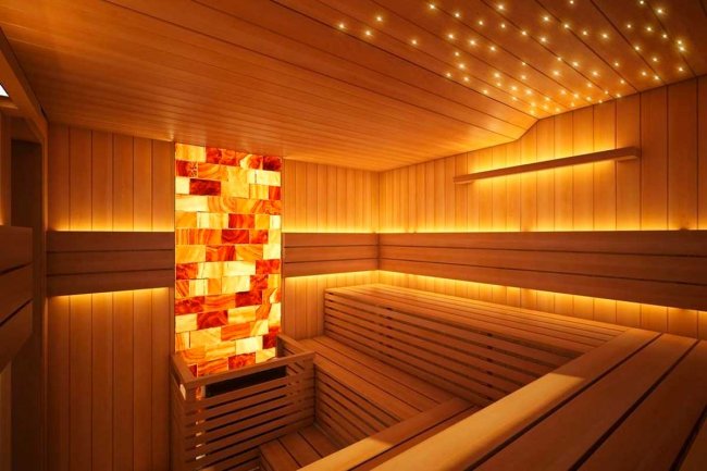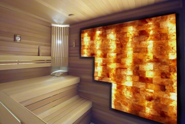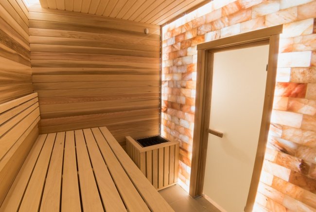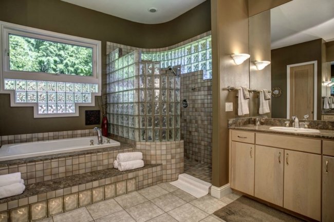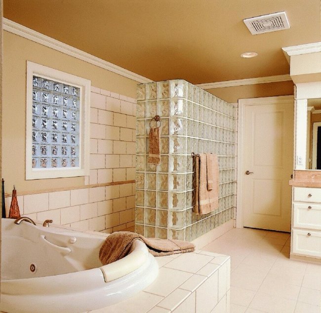 Часто стеклоблоки используют в качестве перегородки, разграничивая зоны душа и сауны. Отделка стен такими элементами также будет отличным решением, поскольку они занимают гораздо меньше места, чем прочие варианты из других материалов.