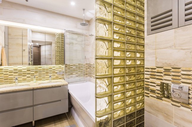 Установка перегородок из стеклянных блоков в квартире – идеальное решение для ванной и туалета, душевой кабины. Полупрозрачные детали не сужают пространство, хорошо справляются со своей функциональной задачей. Их можно использовать как в смежном, так и в раздельном санузле. Блоки собирают в сплошные ряды или совмещают с гипсокартоном, кирпичом, деревом.