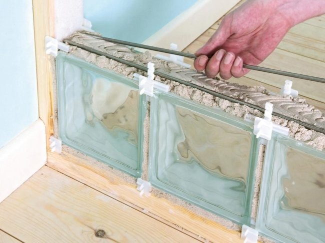 В качестве клеящей смеси используют цемент. Он должен быть однородным без крупных песчинок, которые могут оставить царапины на стекле. Также потребуется приобрести крестики для установки между блоками фиксированного расстояния и придания жесткости. Укрепляют стеклоблочную стену с помощью металлических стержней.