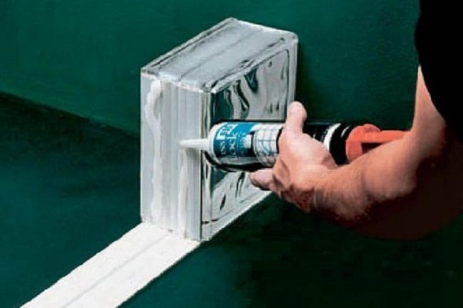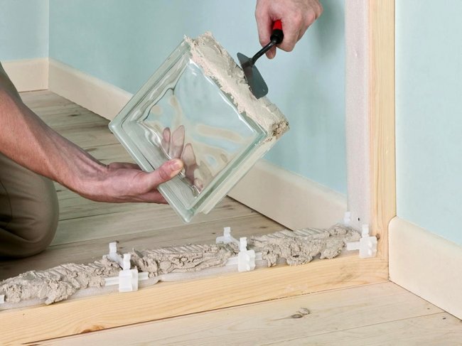 Для укладки прозрачных элементов используют плиточный клей белого цвета. Так швы будут более эстетичными, а вероятность испачкать деталь минимальной. Для начала проверяют целостность стеклоблоков, поскольку производители гарантируют качество элементов только до момента их установки. Затем их кладут рядами, прокладывая армирование для прочности конструкции.