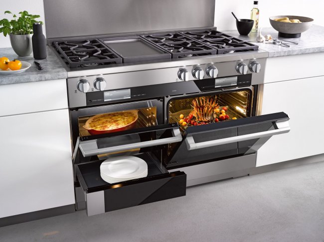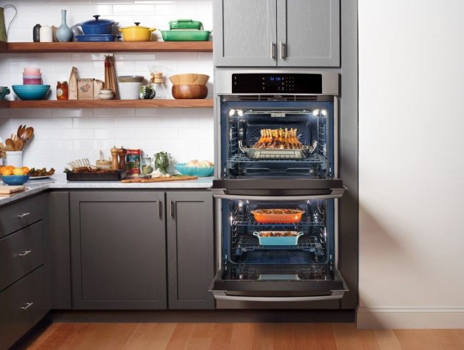 Другой вариант большой духовки – устройства, увеличенные за счет наращивания высоты. Такие модели могут иметь высоту 72 см. Кроме того, приборы могут быть сдвоенными. Общий объем двух объединенных камер превышает 200 л.