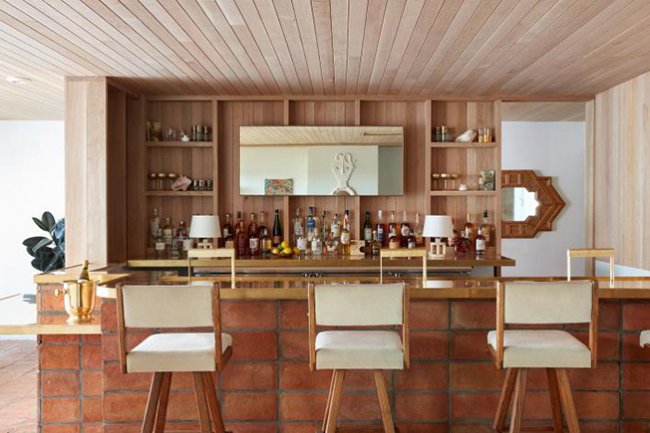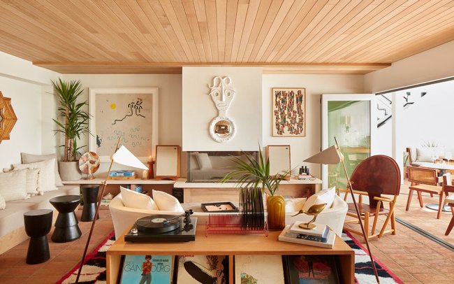Открытые потолки с эффектными балками, промасленное светлое дубовое дерево, латунные светильники с естественной патиной, мексиканская плитка и местная глина — всё вместе создает расслабленный шарм пляжного бунгало.