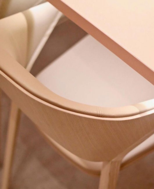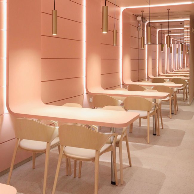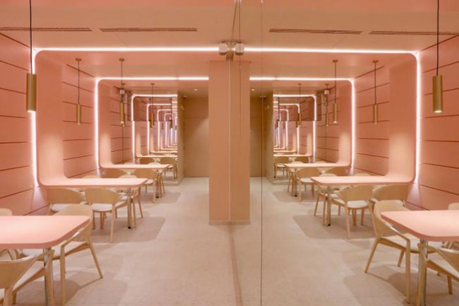 Ora-Ито, дизайнер и партнер Маркса в этом предприятии, создал атмосферу чистую и свежую, как сама пища. И поскольку в гастрономии все вертится вокруг стола, он спроектировал бесконечный стол, спускающийся с потолка и отраженный в зеркалах. Камерное уютое заведение занимает площадь в 170 кв. метров и рассчитано на 50 человек. Комната залита мягким розовым. Деревянные с кожей стулья Ico поставлены Cassina, они были спроектированы Ora Ito для итальянского бренда в 2016 году.